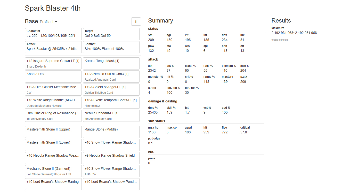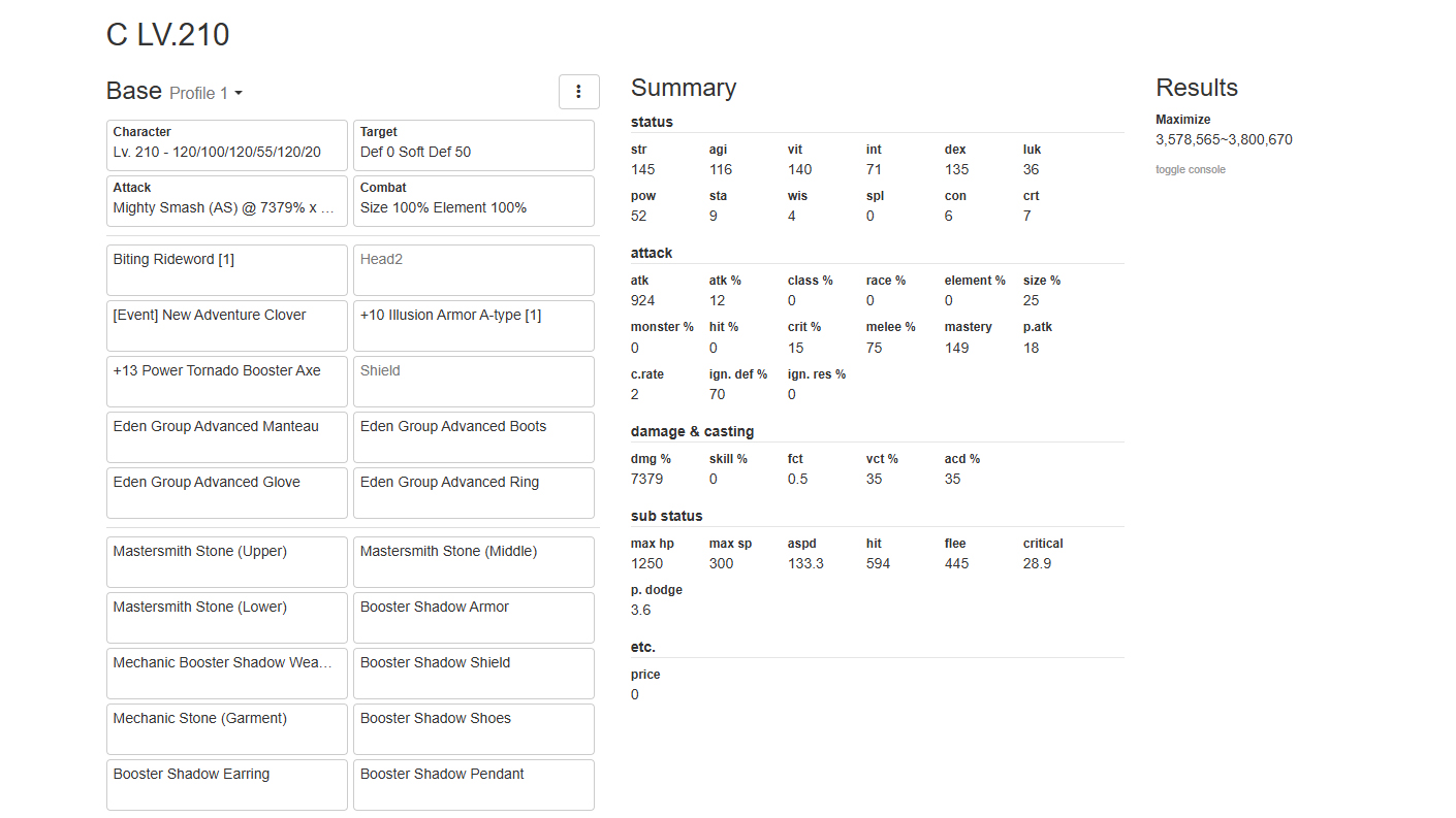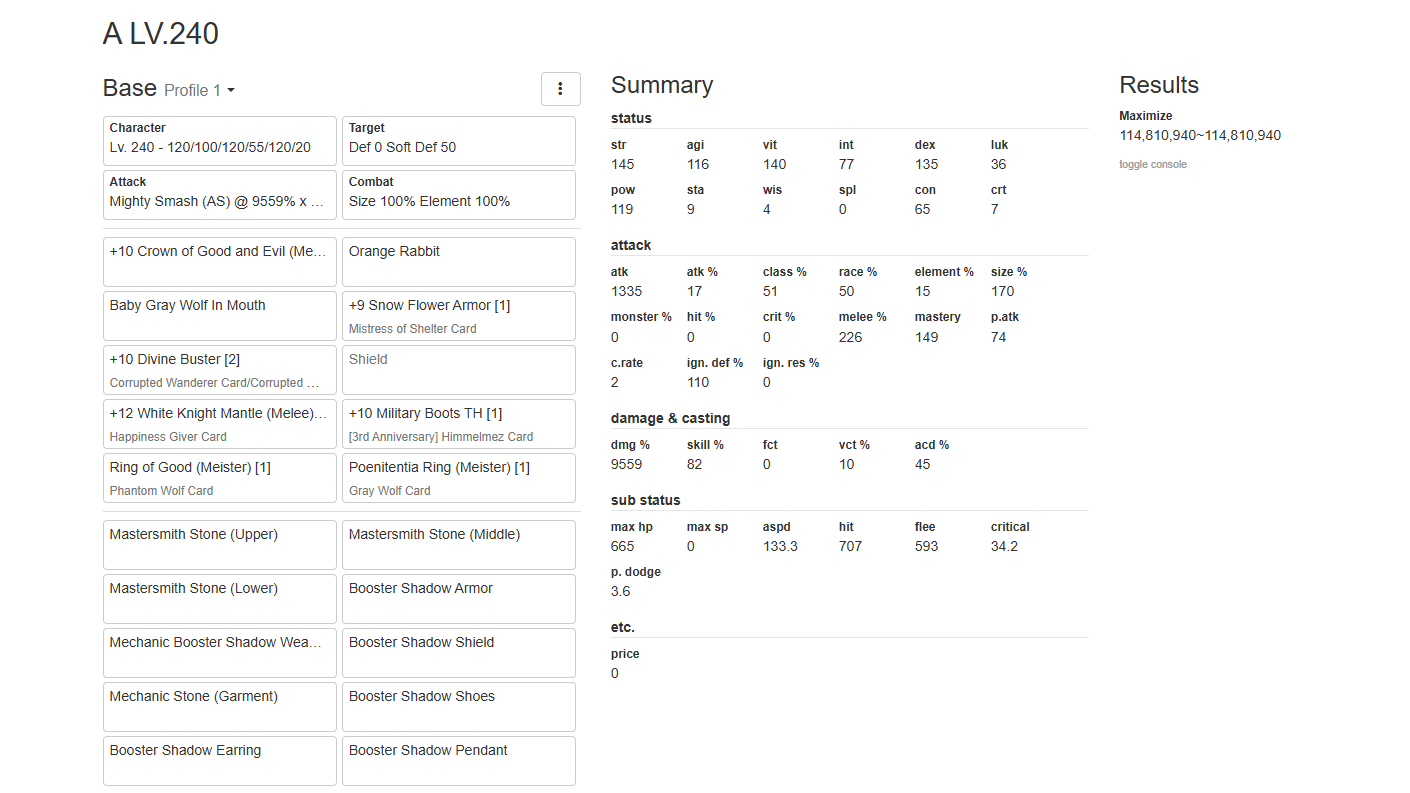 LV.185: STR 120, AGI 100, VIT 120, INT 55, DEX 98, LUK 3