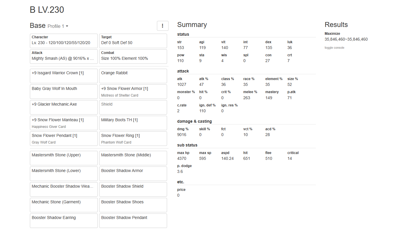 LV.130: STR 120, AGI 90, VIT 40, INT 23, DEX 60, LUK 1